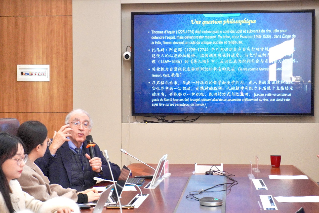 随后进行的“主旨发言”环节将活动推向一个高潮。首位主讲人白乐桑教授围绕以《幽默,一件严肃的事情》为题展开阐述。他指出:中国幽默根植于“间接”与“错位”的文化基因,其含蓄迂回的表达构成跨文化理解的特殊挑战与魅力。白乐桑教授通过丰富的汉语语言游戏与双关语实例,生动诠释了翻译作为一种跨文化“再创造”艺术所具备的高度与深度。紧接着,马修教授在发言中阐释,幽默本质上是文化的产物,既是精神防御的武器,也是衡量群体间理解深度的标尺。他通过追溯“幽默”一词在英、法文化中的历史脉络,阐释了幽默如何通过制造“疏离”来提供审视现实的独特视角。