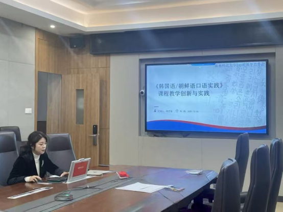 (通讯员 李珂祎)2025年12月5日,澳门pg官方电子平台朝鲜语专业在澳门pg官方电子平台腾龙楼204会议室成功举办“语言赋能·价值引领——新时代韩国语口语实践课程的思政融合途径”专题思享会。本次思享会聚焦朝鲜语专业必修课程,同时也是我校思政示范课程《韩国语/朝鲜语口语实践》的教学改革成果,由该课程讲师韩艺敏老师主讲,朝鲜语专业教师及学生代表与会聆听。