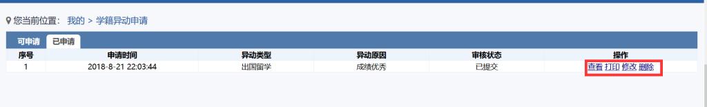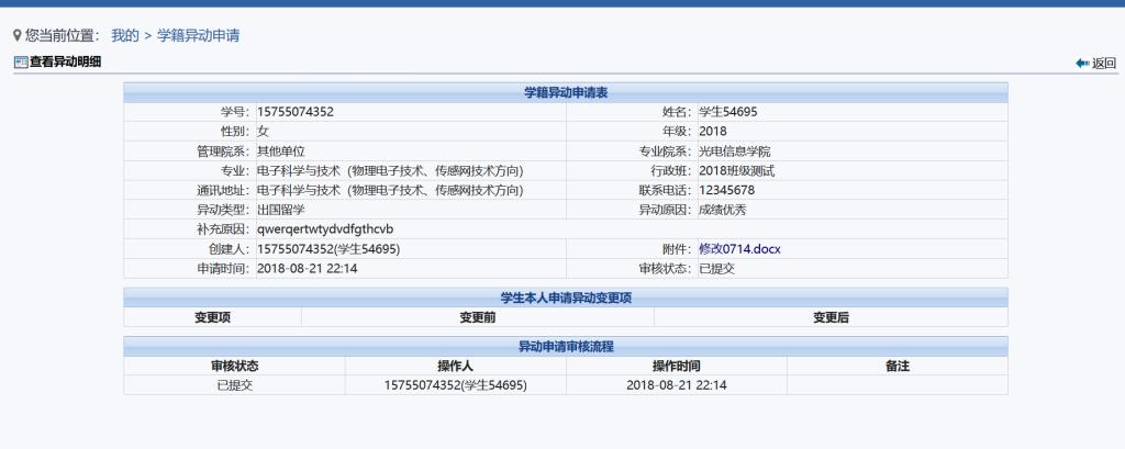 4、完成提交后,学生可以查看到自己的异动申请,如图4所示。