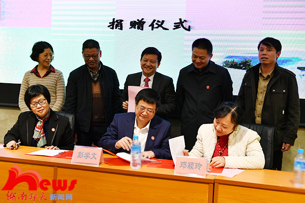 仪式上,彭学文与校友总会秘书长杨玲、邓颖玲一起签订了《腾龙奖学金捐赠协议书》。