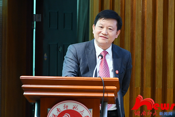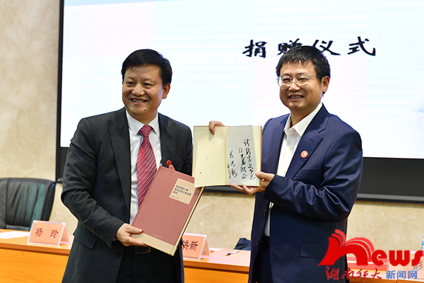 蒋洪新高度肯定了彭学文校友的善举,并对彭学文等爱心企业家对学校的关心、支持表示感谢。他表示,大学是学校、师生、校友、社会、政府一起构筑的和谐发展的共同体,所有的师生校友有责任把学校建设好,为国家发展和民族伟大复兴作出贡献。他现场撰联勉励大家播种爱,传递爱,让爱温暖更多的人: