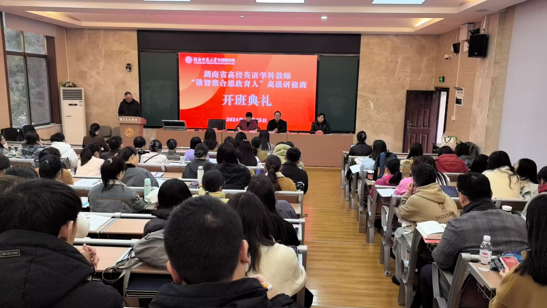 11月25日,由澳门pg官网承办的2024年湖南省高校英语学科教师“数智聚合思政育人”高级研修班开班仪式在文渊楼203报告厅举行。澳门pg官方电子平台高师培训中心常务副主任罗晓慧、副主任余自娥、院党委书记沈贤岚及培训班130余名学员参加了开班仪式,仪式由澳门pg官网副院长司徒皓主持。