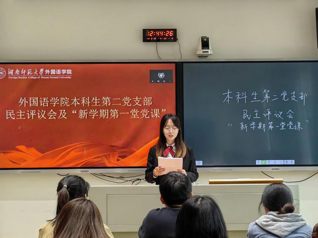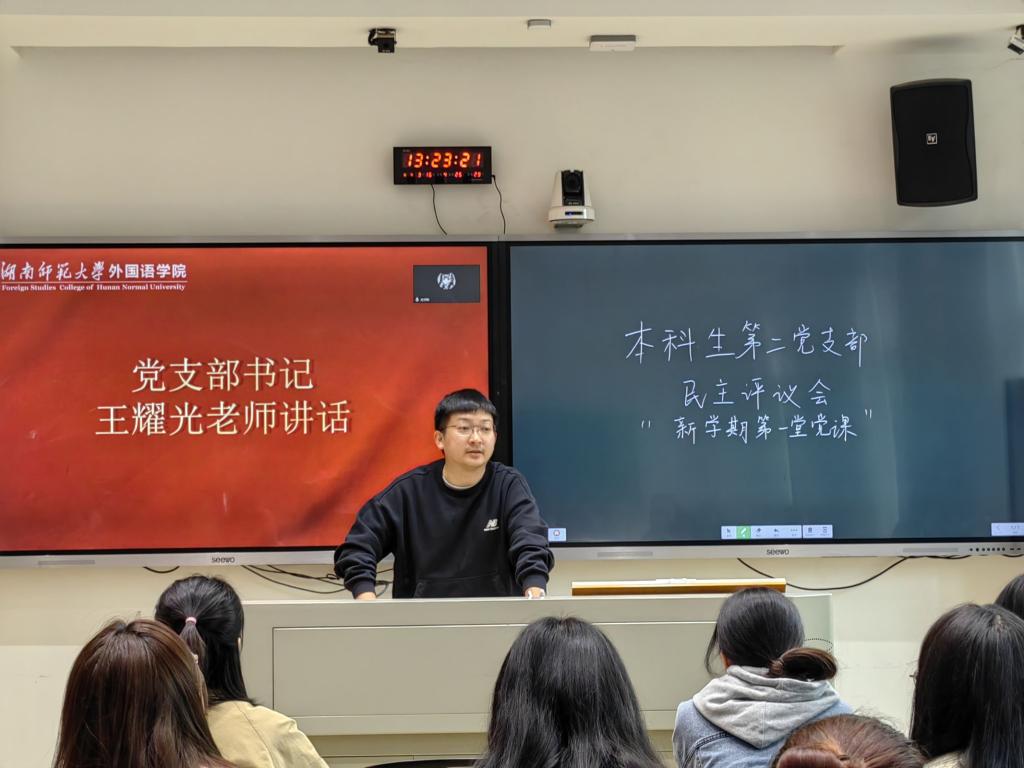 (通讯员 杨佳虹 徐慧兰)为深入学习贯彻党的二十大精神,提升学生党员的理论水平、思想修养和实践能力,助推支部建设,澳门pg官网本科生第二党支部于3月16日在腾龙楼404教室开展民主评议会及“新学期第一堂党课”活动。院团委书记、本科生第二党支部书记王耀光,支部副书记王昭春出席本次会议。