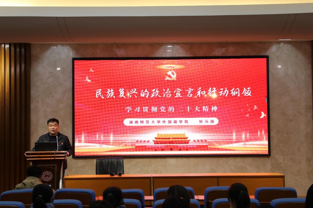 张元强带领全体党员深入学习党的二十大精神。他结合实践经验,从“宣誓一个主题“、”展示伟大变革“、”高举伟大旗帜“、”明确中心任务“、”作出战略部署“、”找到第二答案“、”坚守底线思维“七个方面具体讲解了党的二十大报告。他向全体党员提出四点要求与期望:一是自觉积极地学习领会党的政策和精神,做到意识主动、行为自觉;二是用强大的理论武器武装自己,同时增强认识世界、改造世界的能力,将理论指导落实在实践行动上;三是作为外语人,要增强对中国特色大国外交的全面认同,并努力为中国特色外交事业贡献自己的力量;四是坚定历史自信、文化自信,将外语学习与继承弘扬中华优秀传统文化相结合。