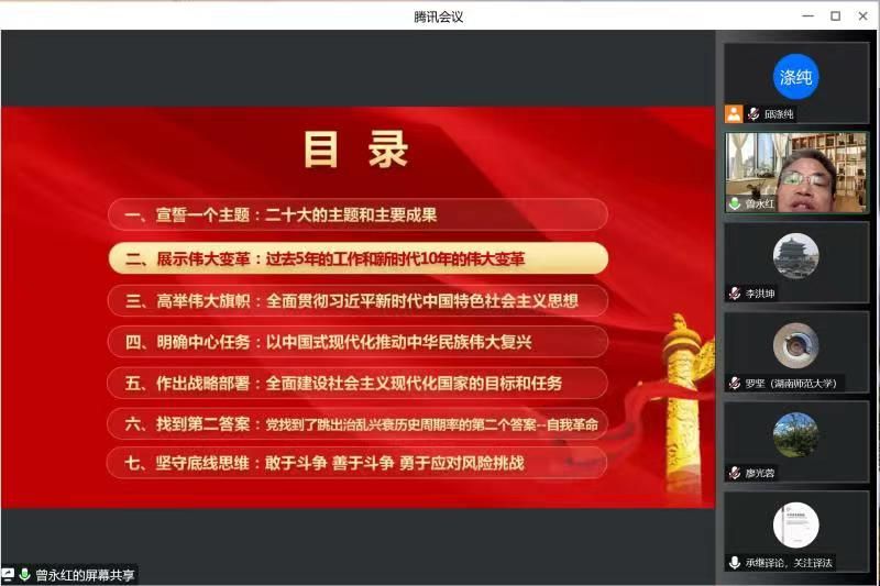 4月7日中午14:10,澳门pg官网教工第二党支部通过腾讯会议平台上了一堂以“学习二十大,奋进新征程”为主题的党课。党课由支部书记曾永红主讲,全体支部党员参加。