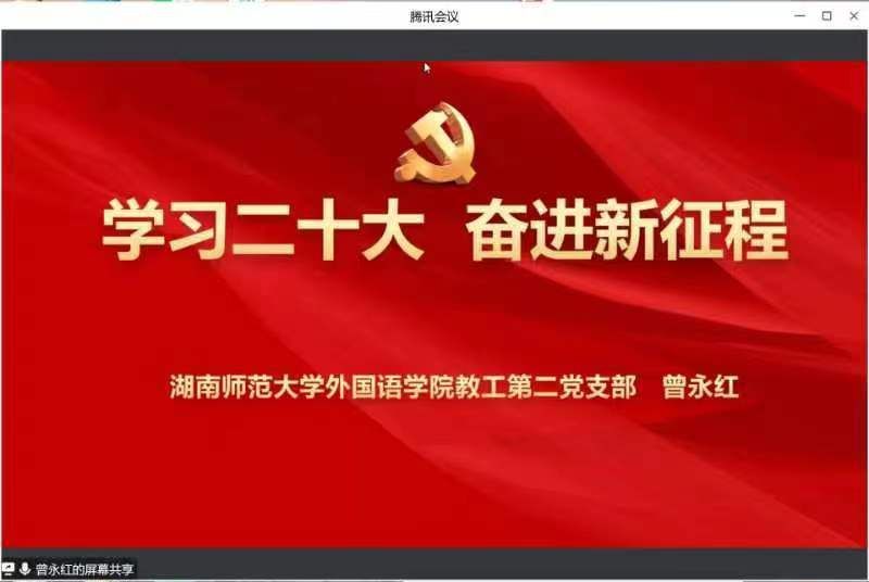 在本次党课中,曾永红书记首先带领大家回顾和学习了党的二十大精神的主要内容,围绕宣誓一个主题、展示伟大变革、高举伟大旗帜、明确中心任务、作出战略部署、找到第二答案、坚守底线思维等七个方面深入浅出地讲述了党的光荣历程和面临的挑战。然后,曾永红书记向全体支部党员介绍了支部2023年部分工作计划,始终坚持“以一流党建助推一流学科建设,凝练特色,打造品牌”为支部工作原则,继续加强湖南省大中小学外语课程思政一体化建设联盟,号召大学生参加“用英语讲好湖南故事”短视频大赛,加强乡村外语教育振兴等。