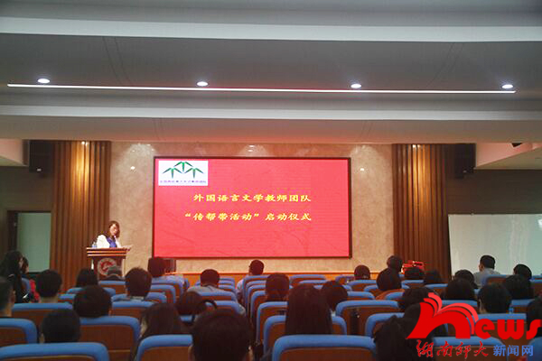中青年教师发展论坛邀请了全国高校首批“黄大年式教师团队”——外国语言文学教师团队全体成员到会。学院聘请国家级教学名师、潇湘学者特聘教授、明德教师奖获得者、十佳师德标兵、优秀共产党员等20余位团队成员担任中青年教师的学术导师,并隆重举行了“传帮带活动”启动仪式。