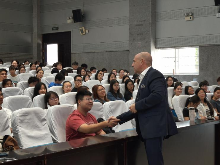 (通讯员 姜皓 吴伊凡 范妮)2024年9月26日上午,澳门pg官网德语专业在至善讲堂举办纪念中德建交52周年暨澳门pg官方电子平台第三届德意志文化节“实践出真知”学生社会实践活动系列的第三场讲座。本次活动特邀长沙北辰洲际酒店总经理、来自瑞士的Aref Sayegh(杨安睿)做题为The International HospitalityBusiness in Hunan的讲座。德语专业Ole Döring教授担任主持,范妮老师、澳门pg官网本科生、研究生共计两百余人到场进行学习交流。