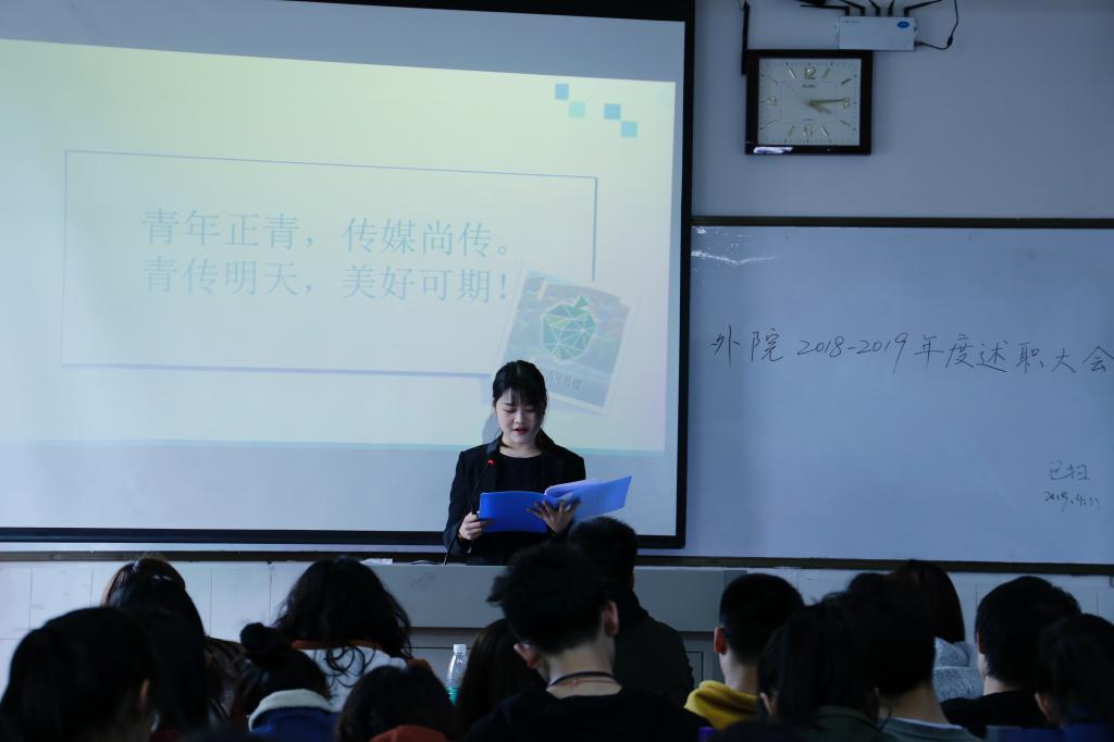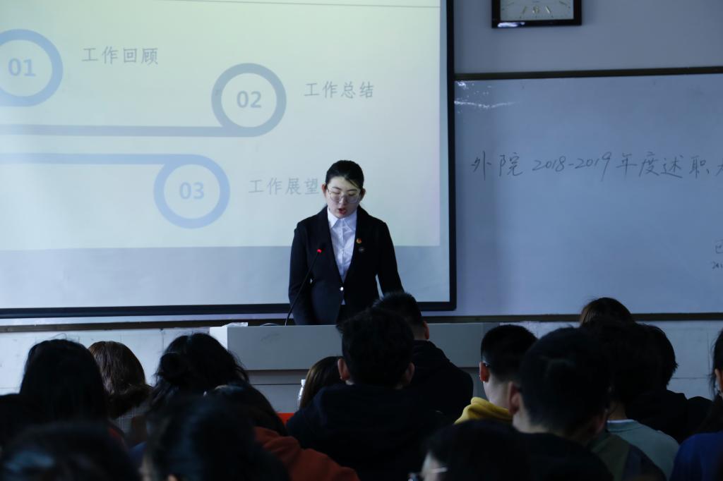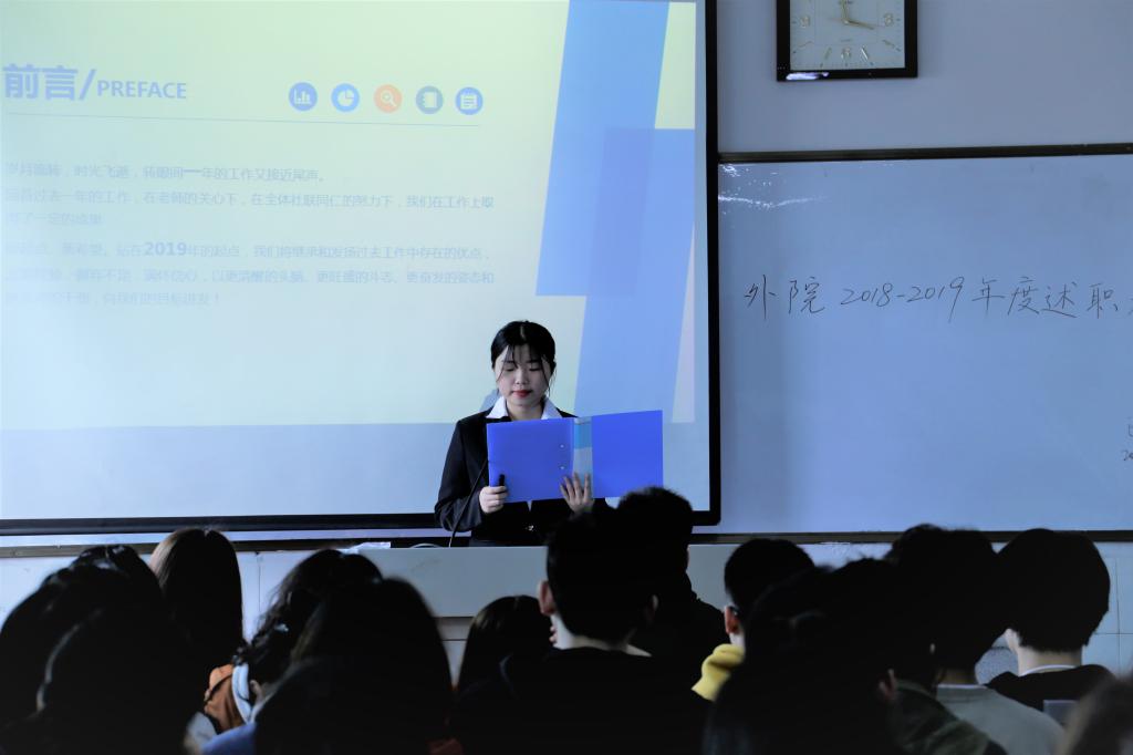 学院团委学生副书记陈静、学生会主席李佳儒、学社联主席肖宇凤、青传主任张明敏依次上台进行工作汇报,分别围绕“德、能、勤、绩、学”五个方面对各系统2018-2019年度工作进行回顾与总结,并对接下来的工作提出了展望和建议。