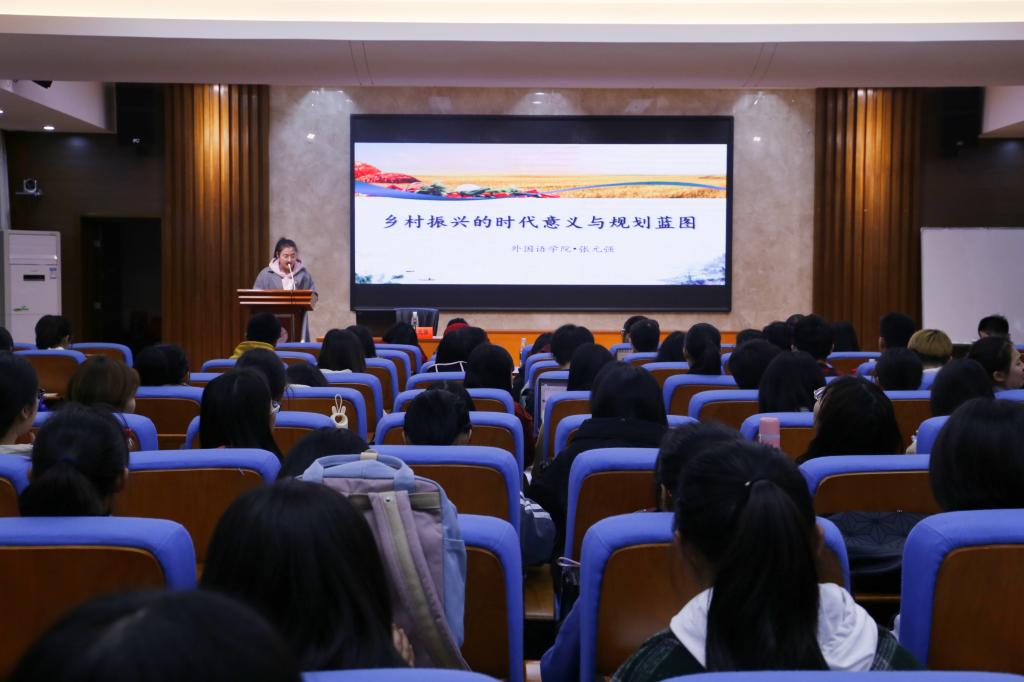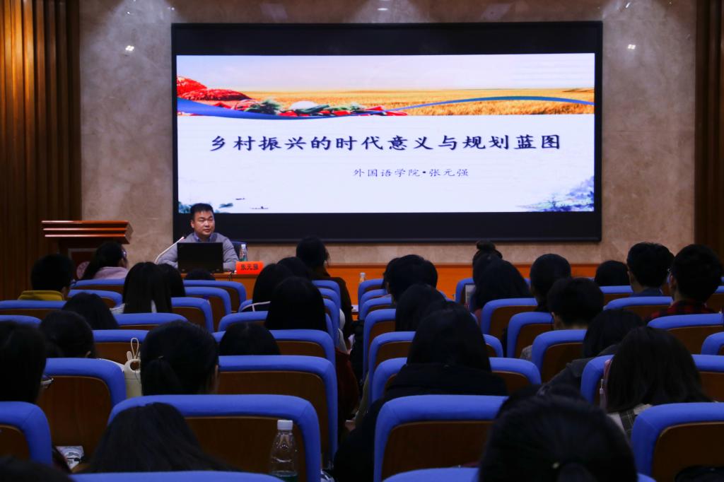 张元强就实施乡村振兴的重大意义、实施乡村振兴的总要求和主要原则、乡村振兴五大中心任务、青年大学生在乡村振兴中如何作为五大方面进行了详细阐述。通过和同学们分享习近平主席对三农问题发表的重要讲话,张元强重点向同学们介绍了乡村振兴的五大中心任务——产业振兴、人才振兴、文化振兴、生态振兴、组织振兴。张元强表示参与乡村建设对于同学们有着极为重要的意义,并鼓励同学们积极参与学院举办的三下乡活动,投身于乡村的建设,为我国的乡村振兴事业做出贡献,为国家全面发展做贡献。