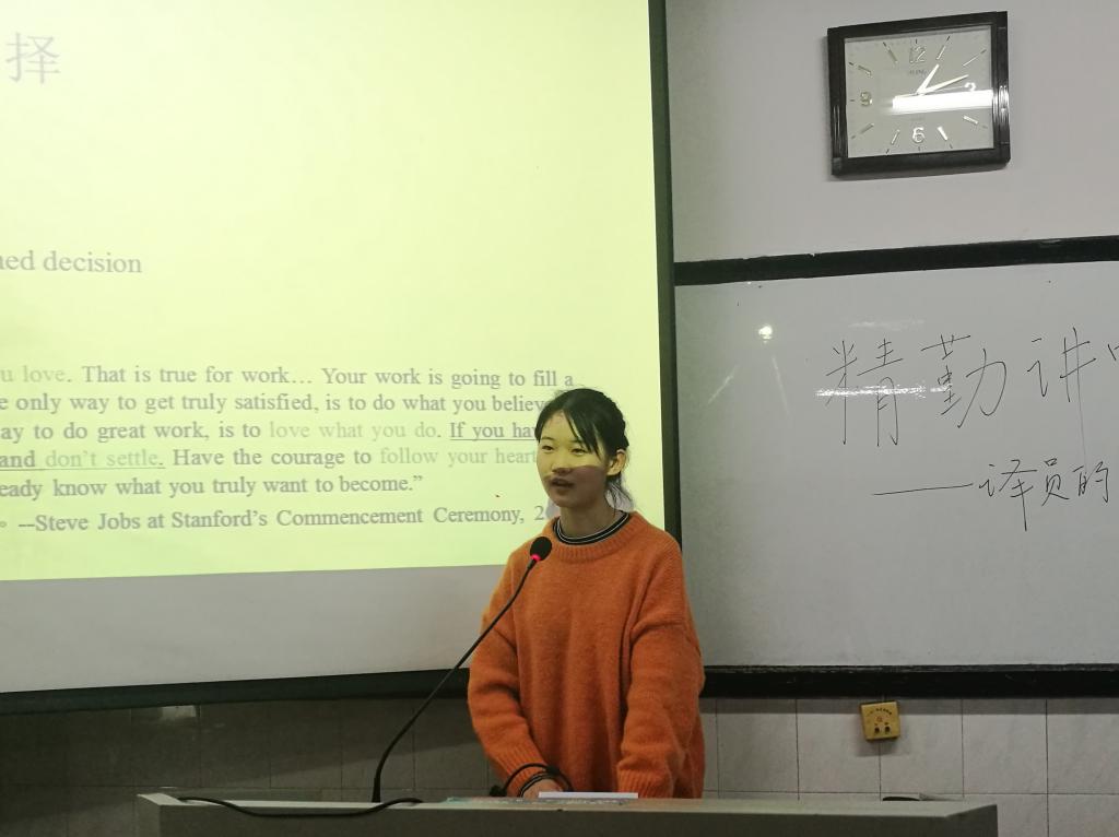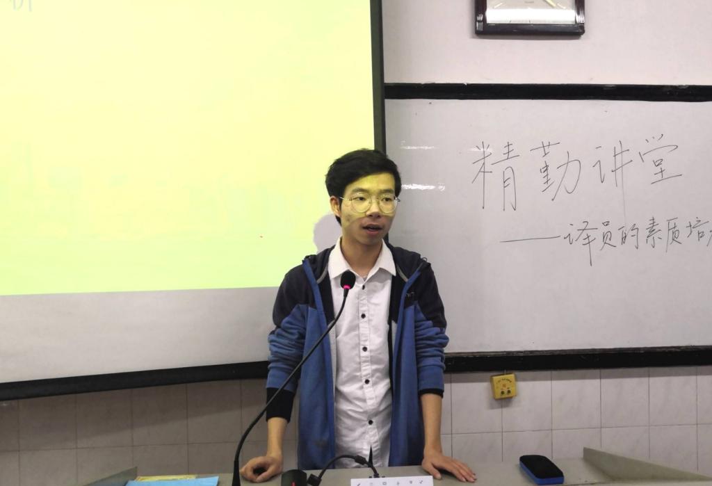 (通讯员 翦宜惠 邱湘)为增进同学们对于笔译和口译的了解,帮助同学们提高自身的专业素质,澳门pg官方电子平台青创部于3月21日中午在304教室开展了以“译员的素质培养”为主题的精勤讲堂。外院2016级英语系张雅涵、陈鹏担任主讲人。部分2017级和2018级同学参与活动。