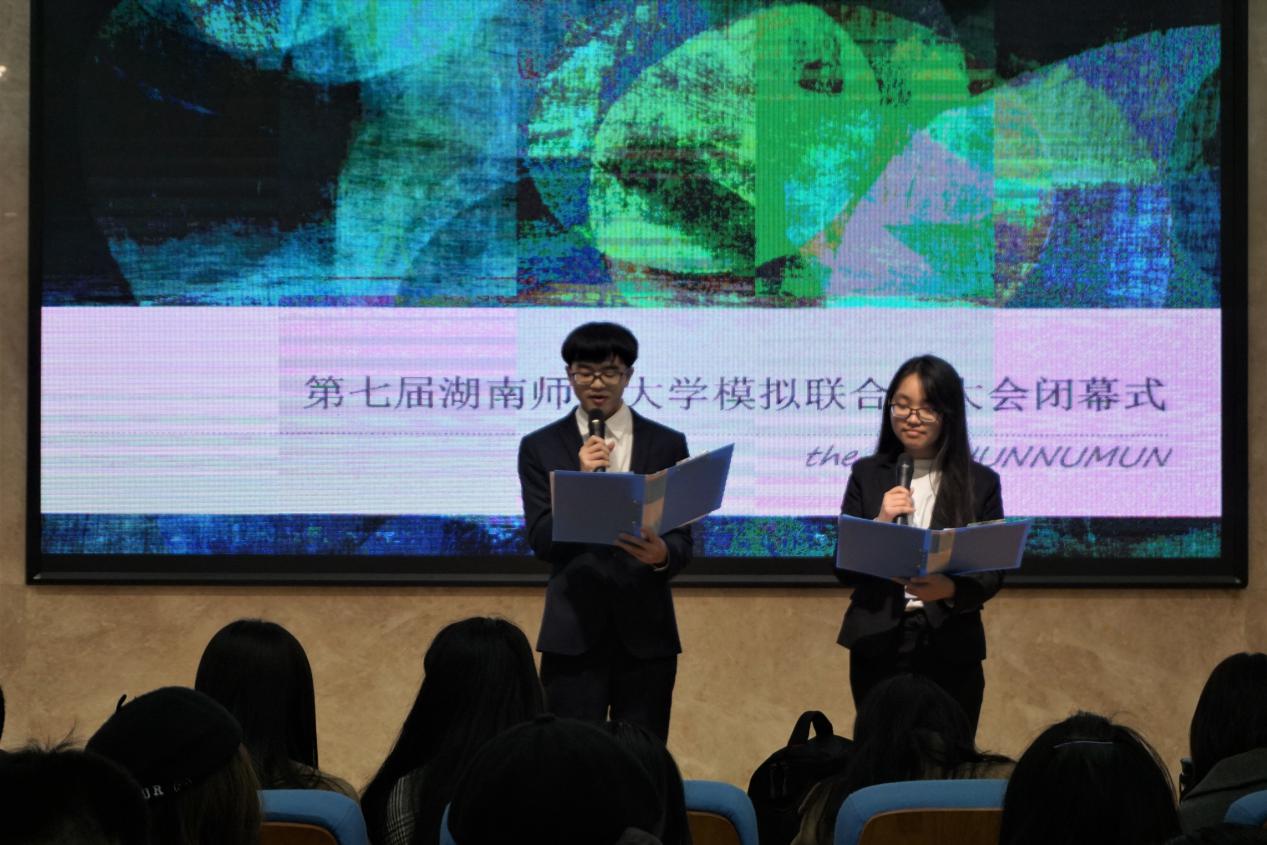 首先两位主持人对大家的参与表示感谢。在播放了一段关于模联代表的回顾视频后,此次大会秘书长沈颖欢发言。她结合自身经历从可以扩宽人际交往,提高学术能力两个方面提出了了此次模联的意义并表示乐于回答大家关于模联方面的提问。随后学术指导陈王子玄对参会代表的做出了中肯的评价并表示对大家未来的模联道路的期待。紧接着三位参会代表分别上台分享了自己此次参加模联的感受并提出了自己对主席团的看法。其中来自中南林业科技大学和湖南工学院代表更是表示欢迎大家参加林科大和工学院的校级模联大会。最后两个委员会的主席团成员上台进行总结与颁奖,至此闭幕式顺利结束。