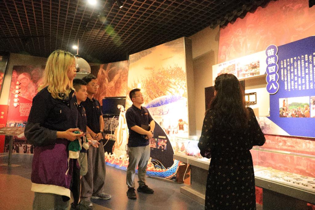 调研活动中,团队在讲解员的带领下参观了湖南非物质文化遗产展厅。雕工细腻的宝庆竹刻、花样繁多的苗族服饰、润色通透的醴陵陶瓷……在位于文化馆一楼的展厅内,一批非遗项目通过实物、流程、图文介绍,既展示技艺也呈现工艺,让团队师生近距离感受非遗的魅力。在展厅中央新推出的数字化非遗互动体验平台,团队师生更是以新媒体游戏的互动方式,深度体验了湖南非遗传统技艺。