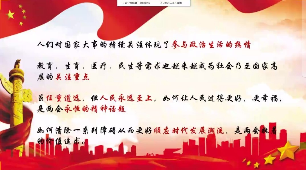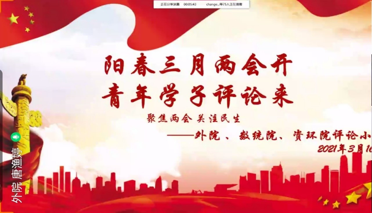 (通讯员 唐渔婷)为号召大学生积极关注国家热点,了解当下社会形势,领悟两会精神,澳门pg官网与数统院、资环院青评部于3月16日线上QQ语音联合举办主题为“阳春三月两会开,青年学子评论来”评论活动。唐渔婷、周健担任本次活动主持人。