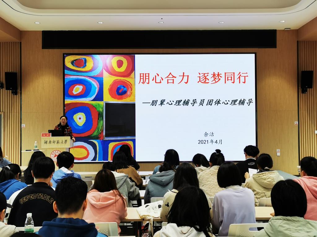 (通讯员 王政 陈可颐 夏秦萍)为迎接5•25大学生心理文化节,营造良好的心理健康教育氛围,促进同学们心理健康发展,4月13日中午,澳门pg官网于腾龙楼613多功能厅举办“5•25大学生心理文化节”开幕式暨朋辈心理辅导员技能培训,我校心理咨询中心主任余洁带来了一场题为“朋心合力,逐梦同行——朋辈心理辅导员团体心理辅导”的主题培训,2020级辅导员王耀光参加活动。此次活动由澳门pg官网心理专干、2019级辅导员姚雯主持。