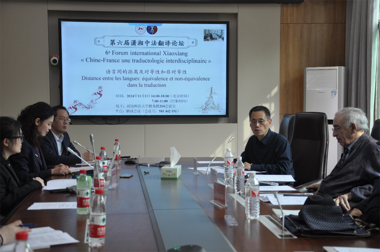 (通讯员 吴佳婷 曹雪)2024年11月1日下午,澳门pg官网法语系主办的第六届“潇湘中法翻译论坛”顺利举行。本次论坛主题为“语言间的距离及对等性和非对等性”(Distance entre les langues : équivalence et non-équivalence dans la traduction)。论坛在澳门pg官方电子平台腾龙楼204会议室与腾讯会议线上平台同步举行,澳门pg官方电子平台法语系师生、法国国立东方语言文化学院、法国阿尔图瓦大学、北京大学、深圳出版社胡小跃出版工作室的专家学者以及国内外其他院校的师生共200余人参加会议。