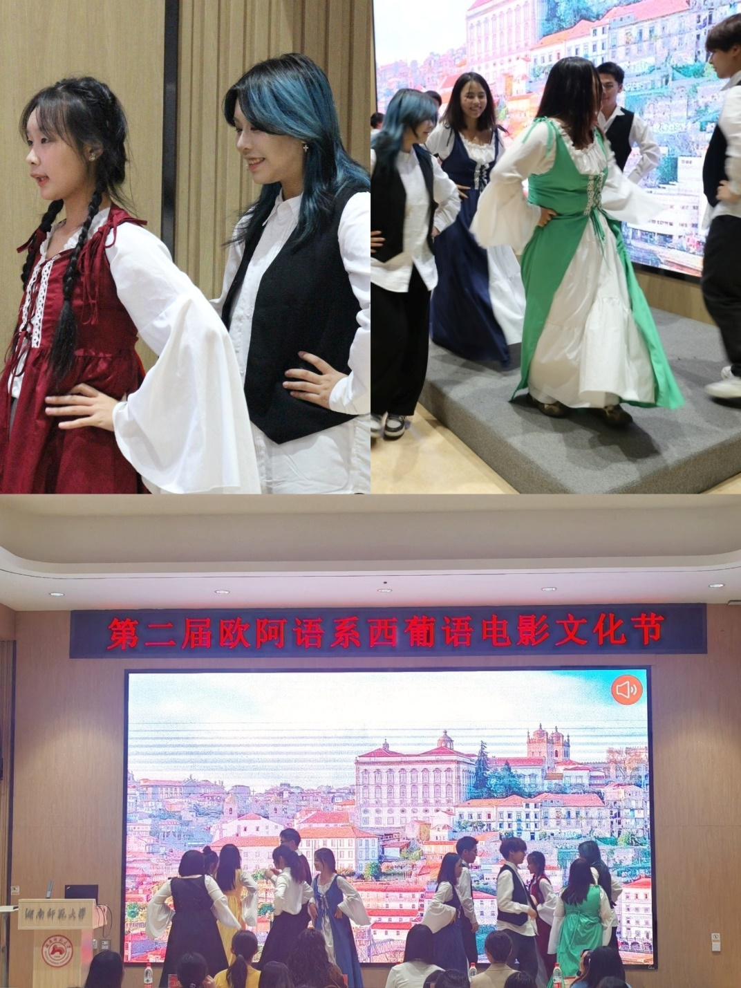 西葡语专业全体师生、2024级新生代表参加了本次电影文化节开幕式和首场观影活动。活动以“时空之旅”为主题,用多种节目形式展现了不同时期、不同地域中西语和葡语文化的社会风貌、历史文化和人文情感。23级葡语学生身着传统服饰表演了热情的葡萄牙土风舞,22级葡语班合唱悠扬清新的葡语歌曲,22级西语班用中西双语演绎了历史剧《特洛伊木马》。本次开幕式的特别节目是西语班与葡语班同学共同合作出演的《寻梦环游记》配音节目,是首次跨专业完成的合作演出。学生们不仅展现了不同文化的独特魅力,更通过精湛的演技和深情的表达,将观众带入了一个个生动的故事世界,游览多样的时空与文化之旅。