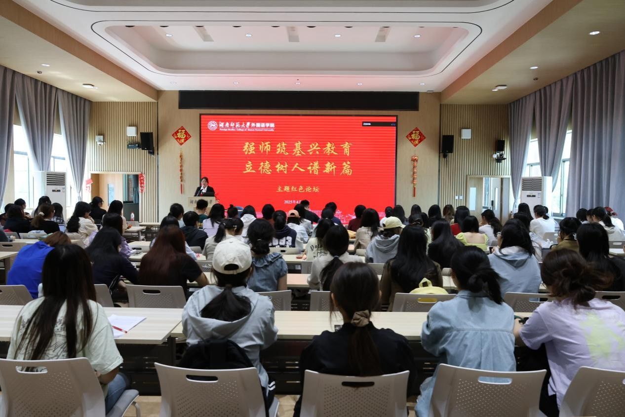 此次红色论坛由优秀学生代表许琳,韩佳琪,凌楚惠担任主讲人,三位学生主讲人结合专业特色与实践经历,分享了青年学子在建设教育强国征程中的思考与实践。许琳以乡村支教为切入点,讲述了所带领的三下乡团队在常德临澧县开展双语文化课程和红色宣讲的经历,用实际行动诠释了“外语教育是文明传承的乡土实践”。韩佳琪以“争做教育筑梦‘大先生’”为主题,分享了在教学技能竞赛与博鳌论坛志愿服务的感悟,认为新时代教师要将开放理念和文化自信融入教育,强调了传播中国声音的重要性。凌楚惠分享了如何将思政教育与外语教学创新融合,她带领团队深挖校本教材,设计“用英语讲中国故事”系列课程,通过组织双语朗诵和湖湘文化教学等活动,实现“语言学习与价值引领同频共振”。