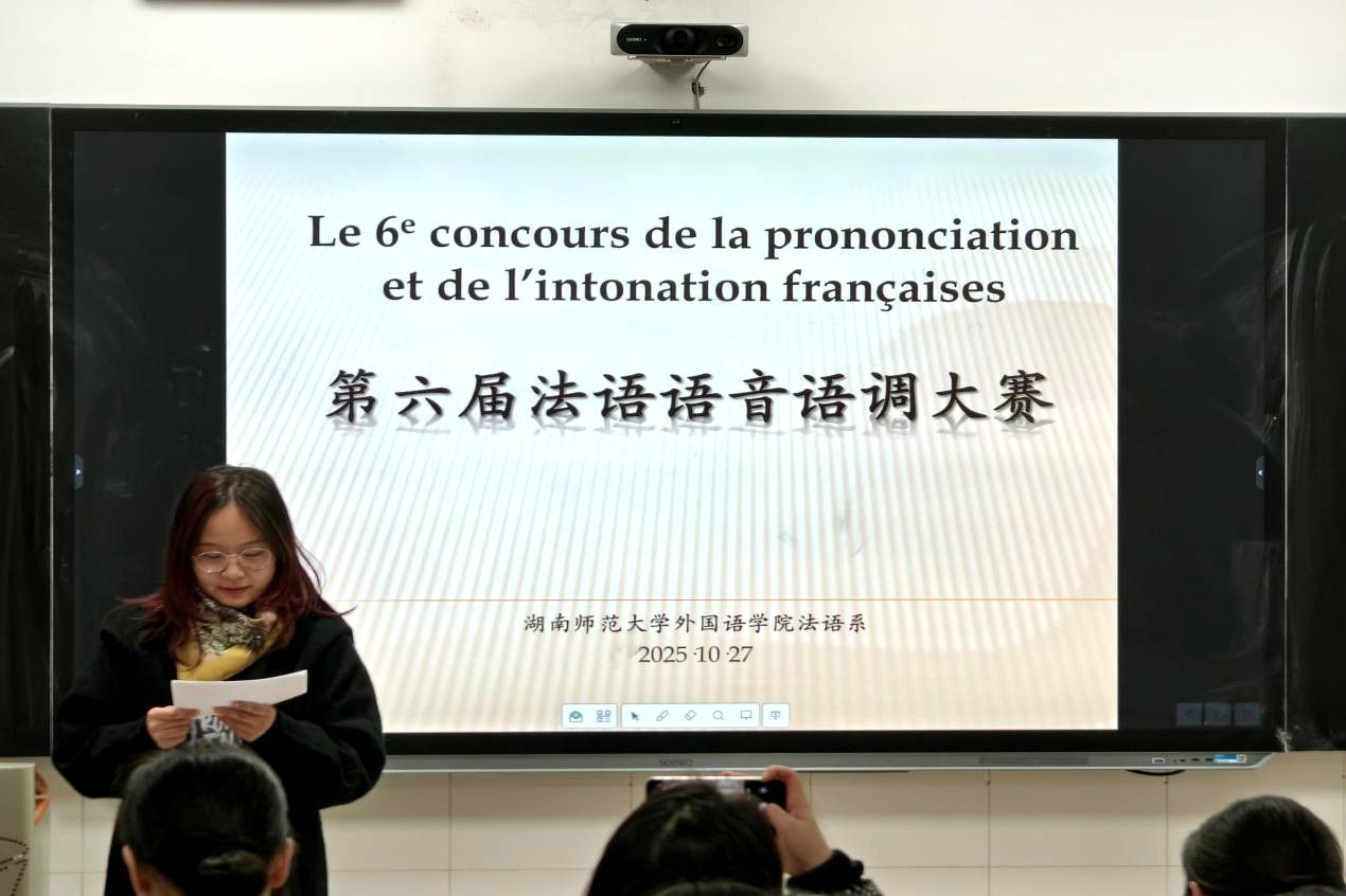(通讯员 吴晨希)10月27日下午,澳门pg官网第六届法语语音语调大赛于至善楼106室顺利举行。此次大赛邀请法语系教师王芳、陈静、陈丹、曾咏柳、宁婧思、曹蓓芳担任评委,由2024级本科生毕君婕同学主持。2024级共30名本科生参赛,2023级部分本科生受邀列席观赛并拍照记录。