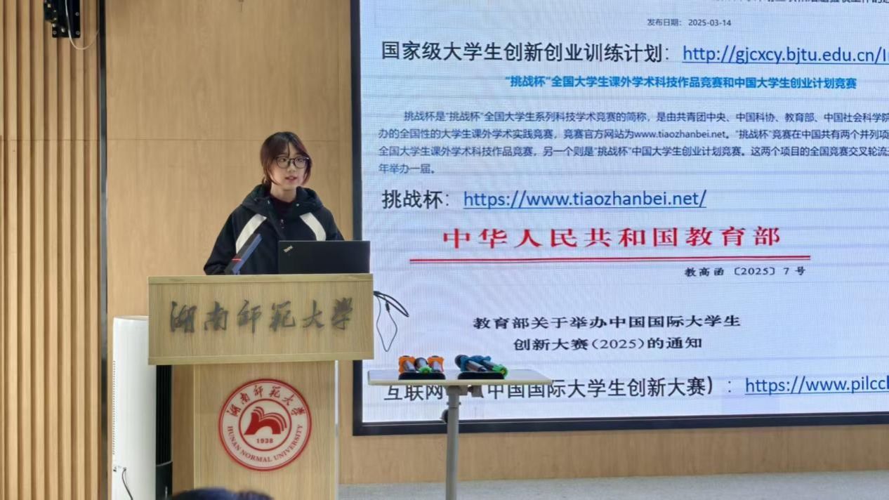 本次讲堂聚焦三大创新赛事,主讲人结合自身备赛与参赛经验,向同学们简要介绍了中国国际大学生创新大赛、“挑战杯”系列竞赛、大学生创新创业训练计划项目(简称“大创项目”)的相关信息,并针对性分享了参与大创项目的实用建议。吴黛琳提到,参与创新创业赛事不仅需要扎实的专业知识功底,更要敢于尝试、主动挖掘机会、全力把握机遇。
