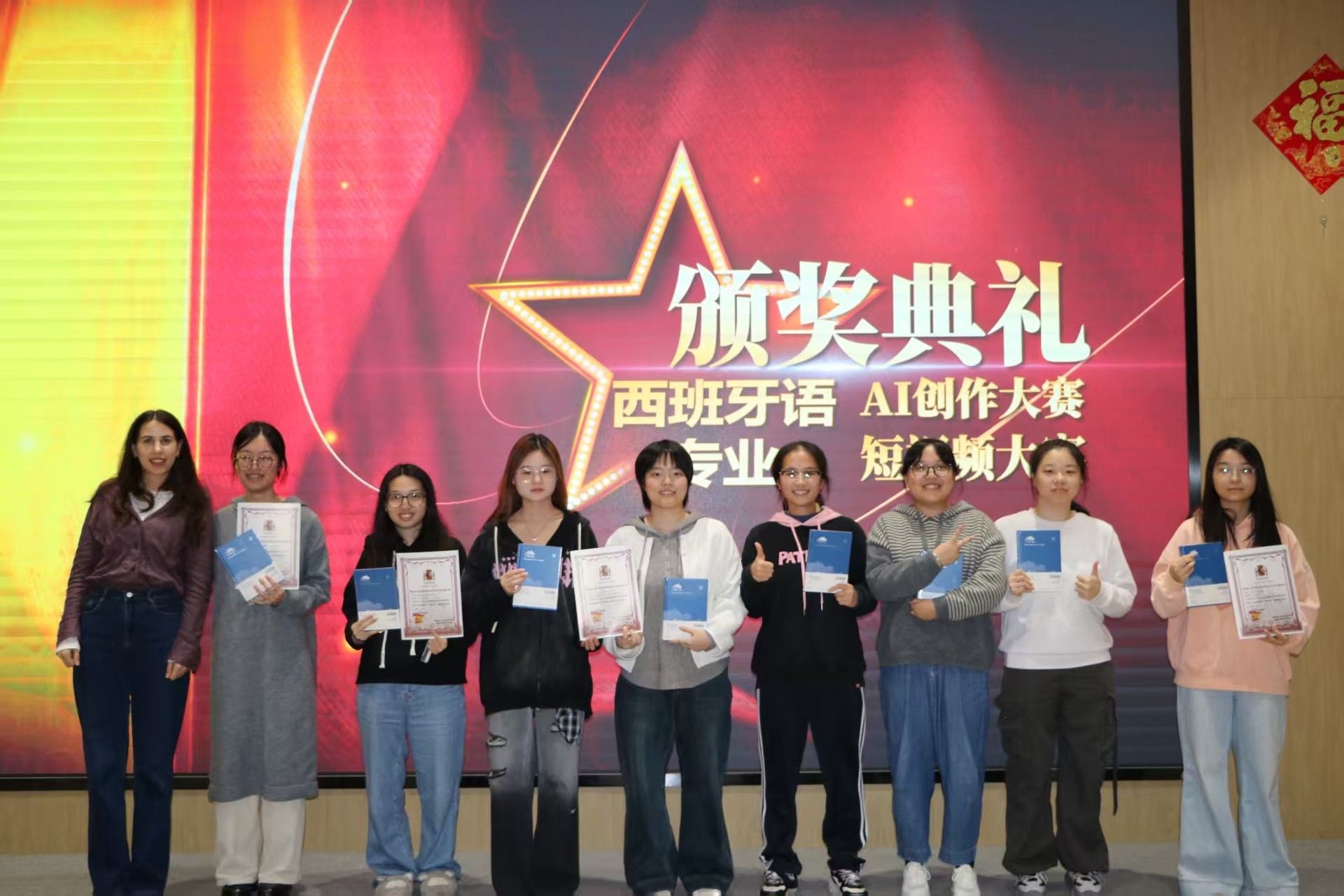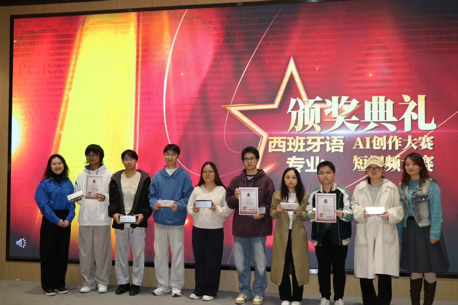 随后举行的“西班牙语专业短视频大赛与AI创作大赛颁奖典礼”将现场氛围推向新的高潮。本届赛事共设一等奖、二等奖、三等奖及优秀奖,22级西语班学生凭借富有思想深度与艺术表达力的原创作品,从视觉语言到AI创造力,全方位展现了新时代学生的数字素养与跨文化表达能力。获奖作品展映环节中,短视频作品《焦虑时代,请从容前行》以清新的风格与温柔的影像抒写青年视角下的时代心绪;AI创意作品《重生的堂吉诃德》则以创新的跨媒介叙事,让经典文学在数字世界中“再生”。现场师生沉浸其中,掌声不断。