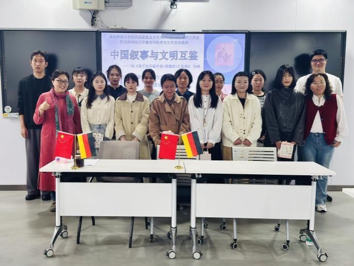 (通讯员 魏伊 龙彪)2025年11月3日,澳门pg官网德语专业与四川外国语大学(以下简称 “川外”)德语学院在至善楼315教室联合举办澳门pg官方电子平台第四届德意志文化节系列活动暨川外德语学院研究生学术实践周文学工作坊。本次工作坊由澳门pg官网德语专业范妮老师与川外德语学院郑萌芽老师共同主持,通过 “池畔说池”“中国叙事与文明互鉴 —— 以《老子出关途中著<道德经>之传奇》为例” 两场文学对谈,为深耕德语领域的学子们打造了一场文学与文明深度交织的文化盛宴。