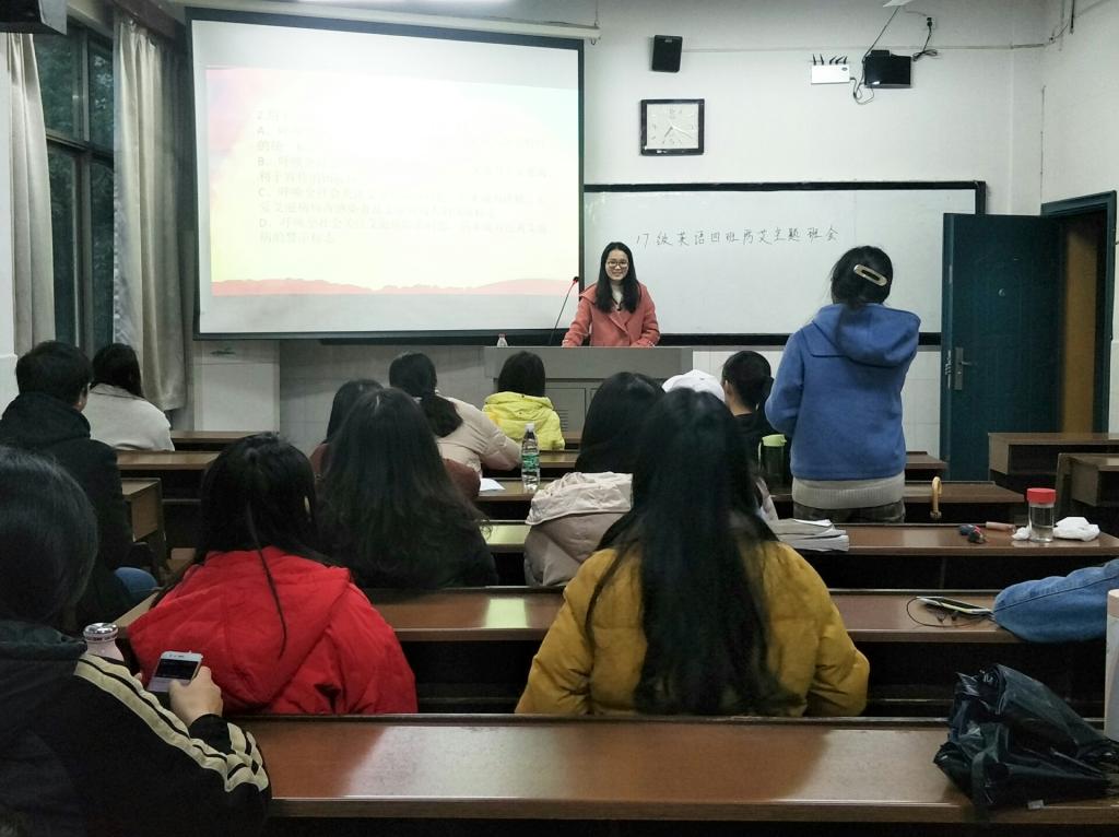 (通讯员 邱湘 谭伊萍 刘璐璐)为进一步普及艾滋病的相关知识,提高同学们的自我保护意识,12月4日上午,澳门pg官网2017级英语四班在404教室举行了“知艾防艾,你我同在”主题班会。此次班会由生活委员杨琳主持,四班同学共同参与。