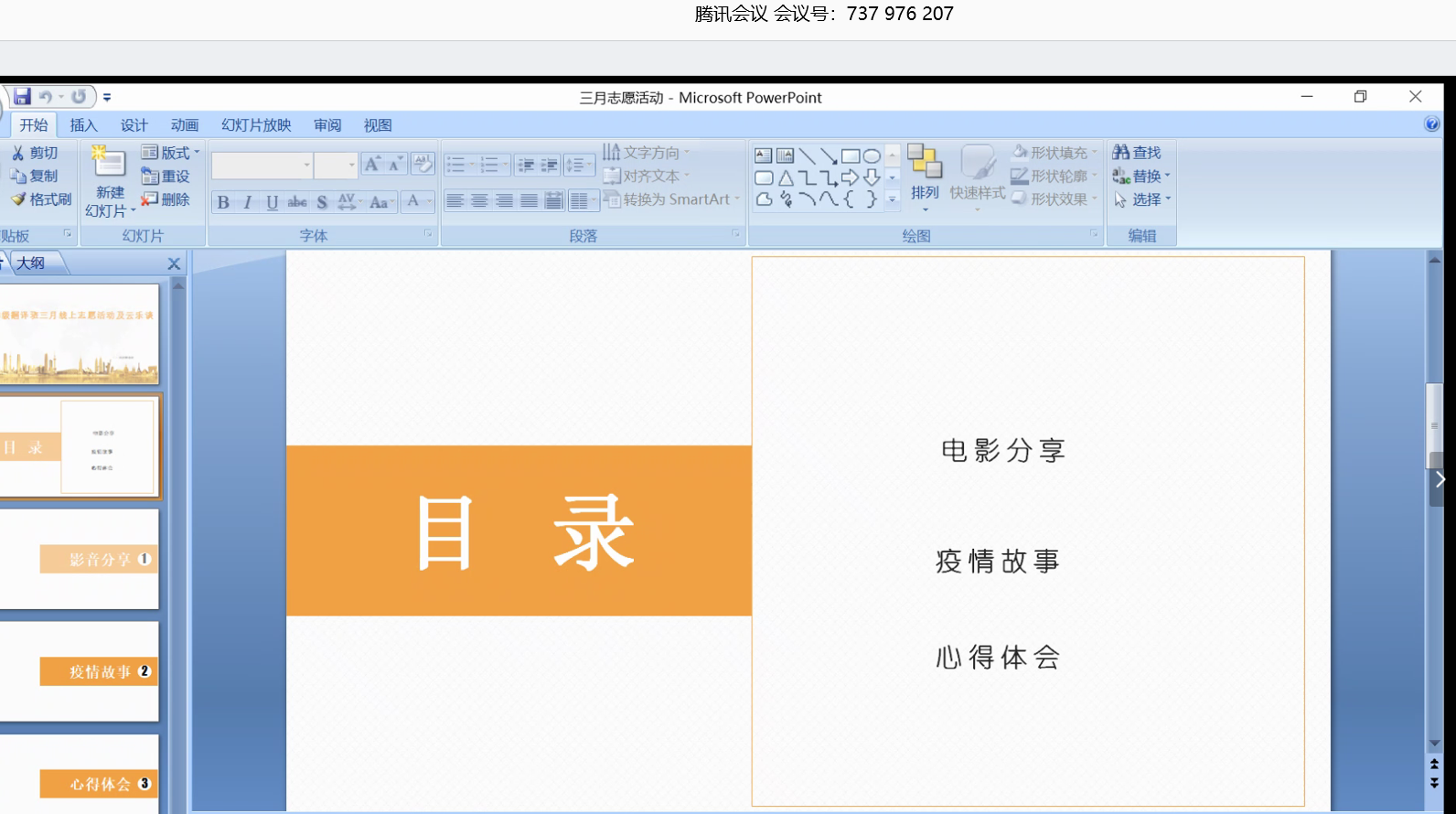 影音分享环节中,杨雨欣同学介绍了电影《十二猴子》,并组织同学们一同观看。同学们认真观看影视片段,结合时事发表所感所想。随后,同学们观看了一段关于中国疫情现状的视频,并由杨雨欣同学为大家讲述其家人在抗击疫情中的真实经历,表达对奋战在一线的医护人员的感激与敬佩之情。此外,同学们还就疫情期间的志愿者活动以及学院的有关推送发表自己的心得体会。大家积极讨论,畅所欲言,用真挚诚恳的语言表达对志愿者的赞美,用理智冷静的头脑进行对疫情近况的思考。