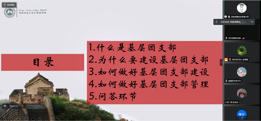 (通讯员 李紫嫣 匡惠美)11月6日上午,为推进基层团支部建设工作的顺利开展,外院开展第十五届同窗团校第一期技能培训之基层团支部的建设与管理。本次培训以线上形式开展,外院全体团委成员和新任团干参与培训。此次培训由团委学生副书记周耀武主讲,青年发展工作部副负责人李婧主持。