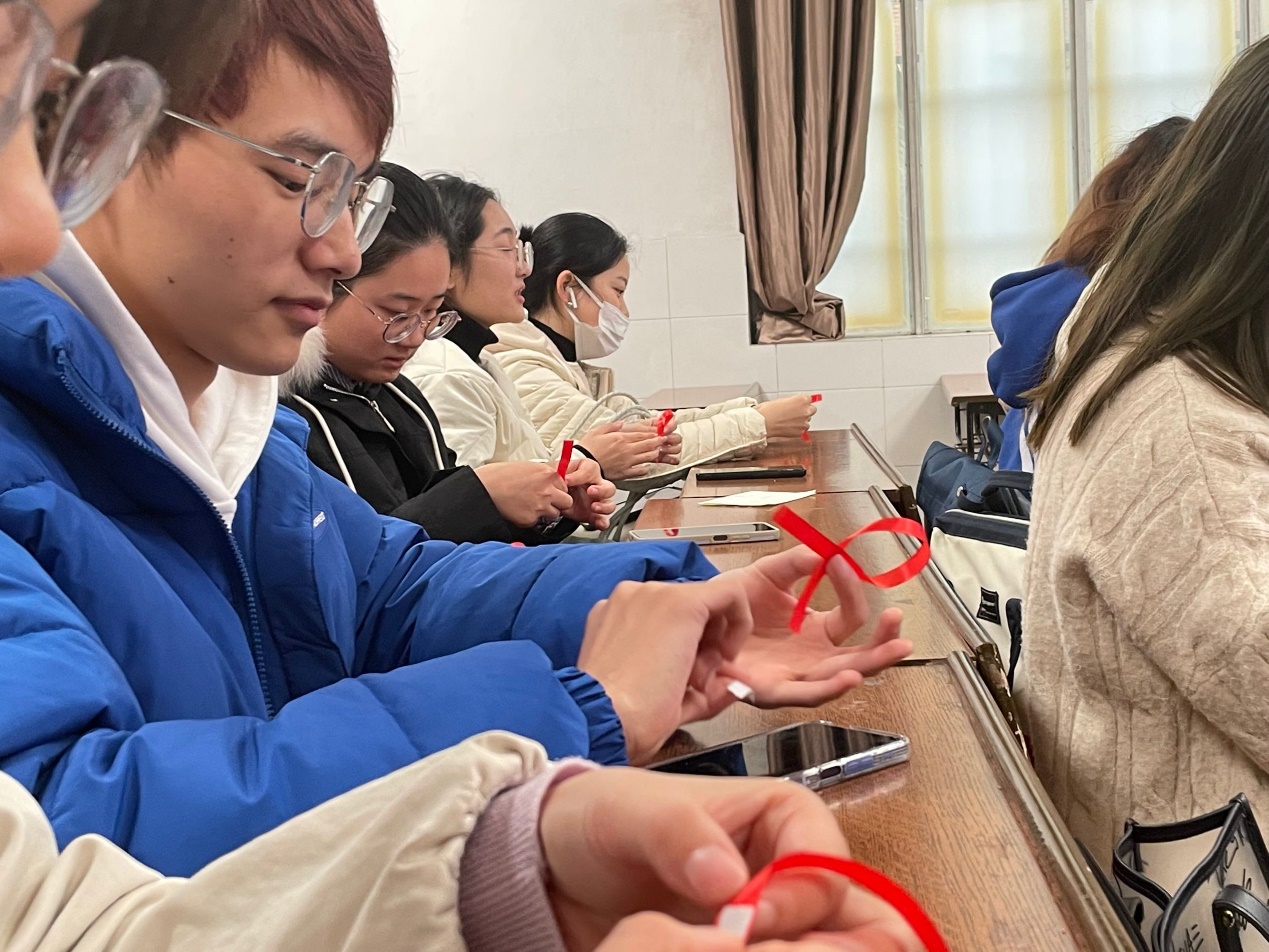 随后进入知识竞答环节,同学们十分感兴趣,积极参与。虽偶有答错但随即田玉便进行纠正和讲解。她表示,只有深刻了解艾滋病,加强预防艾滋病的意识,掌握预防艾滋病的诀窍,才能迈向零艾滋社会。竞答环节后,英语三班全体成员有组织、有纪律地进行了“制作红丝带”、“横幅签名”等活动,三班同学防艾热情高涨,为实现知艾、防艾、抗艾的艰巨任务增添了信心。