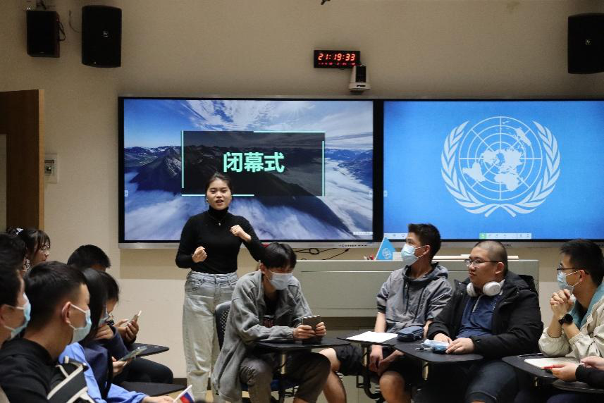 活动伊始,课程学员以小组为单位,仿照联合国形式,在联合国主席的组织下,各组分别代表俄罗斯、中国、美国等九个国家对中东难民安置问题进行陈述和讨论,展现各国的外交立场和理念。