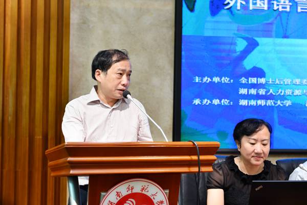 湖南省人力资源和社会保障厅副厅长、厅党组成员黄赞佳,澳门pg官方电子平台副校长廖志坤教授,湖南省人力资源和社会保障厅专业技术处及专家服务中心的有关领导,国务院学位委员会委员、中国翻译协会常务副会长黄友义教授、国务院学位委员会外国语言文学学科评议组成员、北京外国语大学博士生导师王克非教授,上海社会科学院研究员、博士生导师胡键教授,美国加州州立大学洛杉矶分校“当代诗歌及诗学中心”主任、美国加州州立大学洛杉矶分校英文系终身教授Lauri Ramey 4位论坛特邀专家及来自北京外国语大学、上海外国语大学、武汉大学、澳门pg官方电子平台等全国近20所高校的博士后们参加了开幕式。