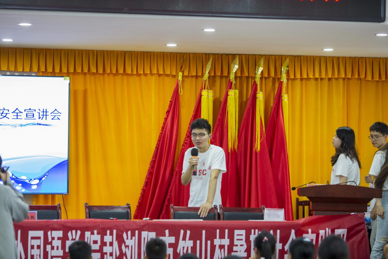 (通讯员 曾琪钰 杨劼 洪菁蔓)为深入贯彻青少年安全教育,提升乡村学生防溺水意识,7月9日下午,澳门pg官网赴浏阳市官渡镇竹山村暑期社会实践团开展防溺水宣讲会。活动由团队成员莫宏伟担任主讲人。