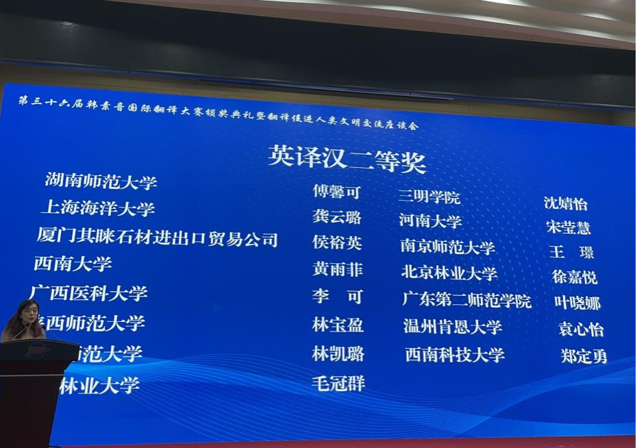 (通讯员 傅馨可)11月23日,由澳门pg官网承办的第三十六届韩素音国际翻译大赛颁奖典礼暨翻译促进人类文明交流座谈会在北京盛大举行。澳门pg官方电子平台研究生第一党支部副书记傅馨可和党员吴子毅分别荣获第三十六届韩素音国际翻译大赛英译汉二等奖和优胜奖。