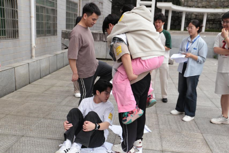 腾龙楼内的 “几手几脚”游戏,完全采用英文发号施令。“Three hands and two feet on the ground!”“One hand and four feet touching the wall!”随着裁判用流利的英文下达指令,选手们迅速反应,手脚协调配合,在保持平衡的同时完成指定动作。在紧张激烈的角逐中,选手们不仅锻炼了身体协调性,更在实践中提升了英语听力与即时反应能力,现场不时响起因成功完成高难度指令而发出的欢呼与赞叹。队员们密切沟通、相互支持,在保持身体平衡的同时完成规定动作,充分展现出良好的团队凝聚力与协作精神。