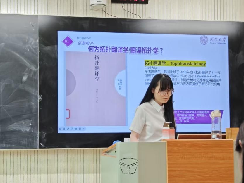 19日下午,一班学员在班级研讨中亦踊跃交流,展现了新一代年轻学者的学术热情。来自南开大学的硕士研究生林晓萌同学与澳门pg官方电子平台的硕士研究生李美姿同学分别就自己深耕的翻译学、英美文学领域展开理论与文本批评。林晓萌同学以“翻译拓扑学/拓扑翻译学义理及其应用——一种跨学科面向”为题,详细地汇报了翻译学理论中一种较为新颖的跨学科理论范式“拓扑翻译学/翻译拓扑学”。林同学以兰州大学学者撰写的《拓扑翻译学》一书为基础,从拓扑翻译的思想简介、理论可行性、框架与研究方法以及论文实例中解读这一数理转向的概念框架。鉴于人类文化的表面现象可能是杂乱无章、复杂多变的,但其内在形式是统一的,并且是相互联系的,具有一定的规律,故而文化的多重表达形式下存在“恒量”和“常数”可直接抽象为“拓扑的”文化结构。她从拓扑异构、拓扑变换、变量、不变性、恒量、同胚、映射、点价、显性拓扑、隐性拓扑等概念为同学们详细阐释了不同概念的翻译描述情境。汇报指出,文学翻译语料作为满足“最佳拓扑原则”的文体风格,在把握互文传播中恒量原则的前提下,可对洞察“文化互文”下变量的不同构形变化为翻译研究拓展了一扇新颖的窗牖。