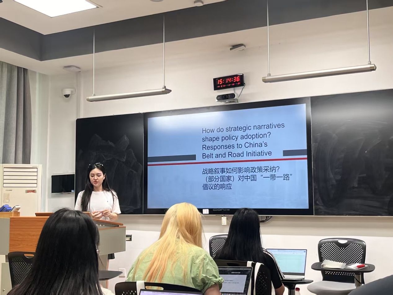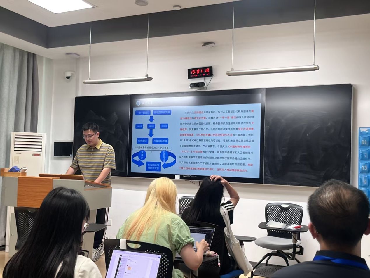 6月17日下午,两场聚焦前沿议题的学术分享相继展开。其一,来自澳门城市大学的博士研究生于金力同学以“How Do Strategic Narratives Shape Policy Adoption?”为例展开文献阅读分享。她聚焦我国的“一带一路”倡议,通过构建“物质利益—本体安全”框架和对哈萨克斯坦等7个国家的比较研究,系统阐释了战略叙事在政策采纳过程中的关键作用。研究发现,成功的战略叙事必须同时满足物质利益诉求和本体安全需求,这一结论为理解国际政策传播机制提供了新视角。分享还客观评估了该研究的理论创新与局限,为后续研究指明了方向。其二,来自湘潭大学的硕士研究生王琛同学则以《中国税务年度报告(2023)》为例做学术分享。他基于变译理论,分析了税务翻译面临的专业术语、文化差异等困境,探讨生成式 AI的技术应用。该研究通过增、减、编等变译手段提升译文可读性,构建 AI 分析模型,为税务翻译国际传播和推动国际税收合作提供了新思路。两位同学的精彩分享引发了在场师生的热烈讨论和深入交流。此次学术分享不仅展现了青年学者扎实的理论功底和敏锐的问题意识,也通过国际关系与翻译研究的跨学科对话,为“一带一路”政策传播与国际税收合作等现实议题提供了创新性的研究视角和方法论启示。