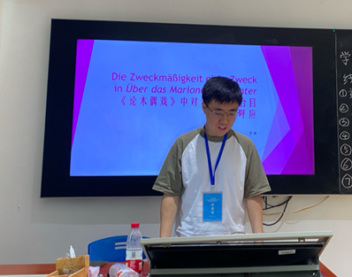 6月27日,由于洋同学和骆悠悠教师进行学术汇报。于洋同学以“论木偶戏中对无目的而合目的呼应”为主题,首先为大家放映了德国木偶戏的表演视频。然后于同学进行了理论综述,介绍了康德美学体系中“无目的而合目的性”这一原则,简而言之,是指在审美实践中主体应当摒弃利害关系和主观目的。接着于同学进行文本分析,木偶作为一种无意识的人本身不具备任何主观目的,青年的秀美是人原初的特性、并非因为吻合了主体的认知能力,所以可以看出克莱斯特认为美是完全剔除了理性的,甚至“在有机界中,反思越模糊越微弱,美就越闪闪发光,就越主宰一切。”
