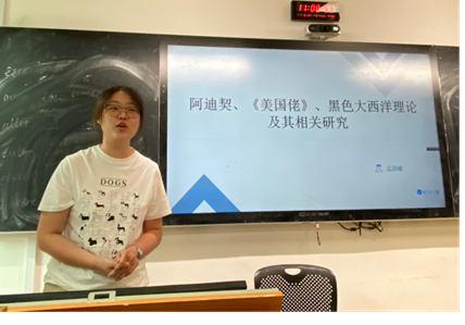 6月24日,由孟晨曦和段可欣两位同学进行学术研究汇报。孟晨曦同学围绕“阿迪契、《美国佬》、黑色大西洋理论及其相关研究”展开分享。在研究背景部分,首先介绍了尼日利亚作家奇玛曼达·恩戈兹·阿迪契的生平与创作,重点分析了其女性主义思想,同时阐释了阿迪契对“单一故事危险性”的批判,强调以多元叙事对抗单一话语,并指出作家对非洲历史现实和移民生存境遇的持续关注。随后介绍了小说《美国佬》的主要内容,以及黑色大西洋理论的三大核心架构。在研究内容部分,该研究以“主动离散”为切入点,探讨数字时代移民群体如何通过技术媒介重构文化身份,揭示了全球南方文学对离散理论的现代性突破可能。