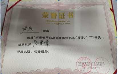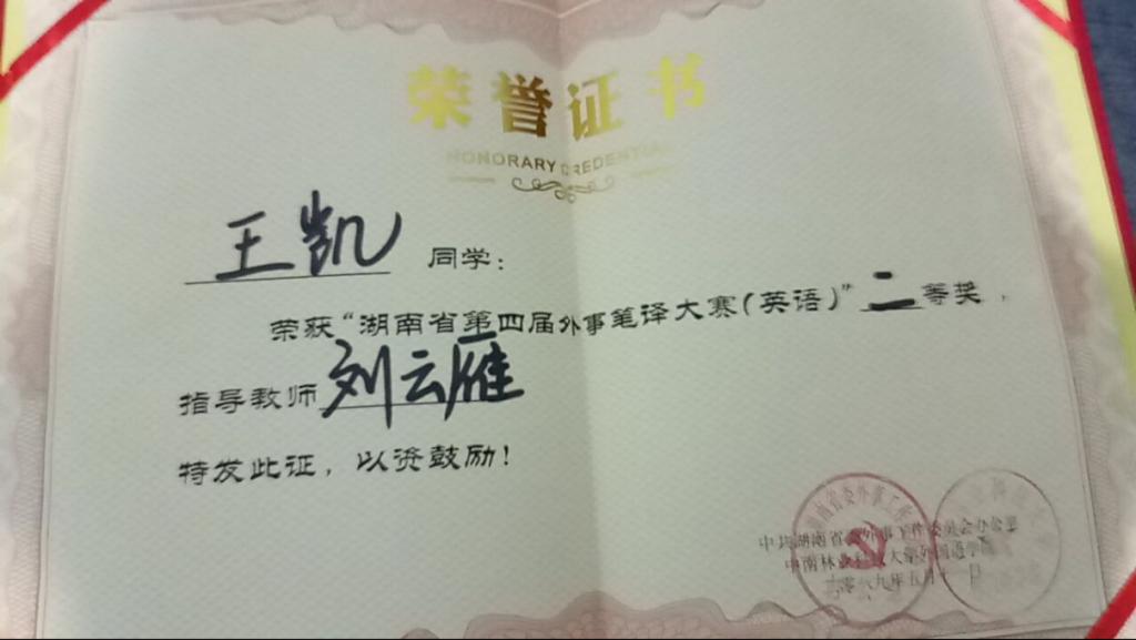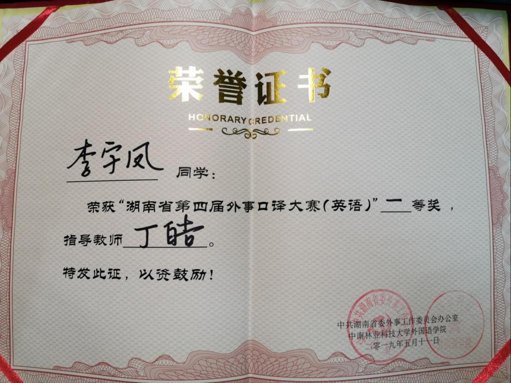 本次大赛由中共湖南省委外事工作委员会办公室主办、中南林业科技大学承办。最终,王凯同学荣获湖南省第四届外事笔译大赛(英语)二等奖。