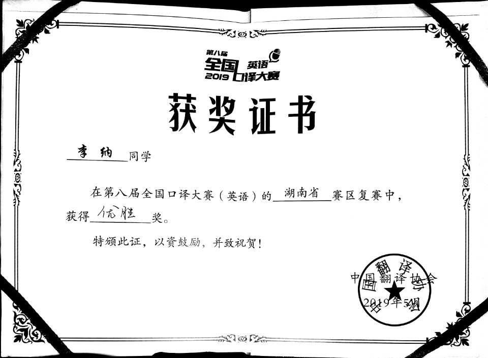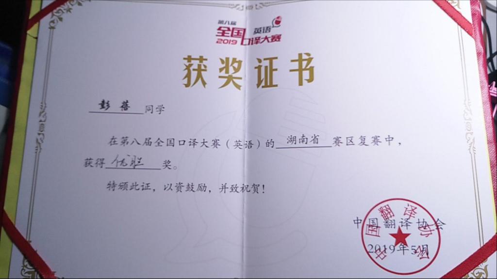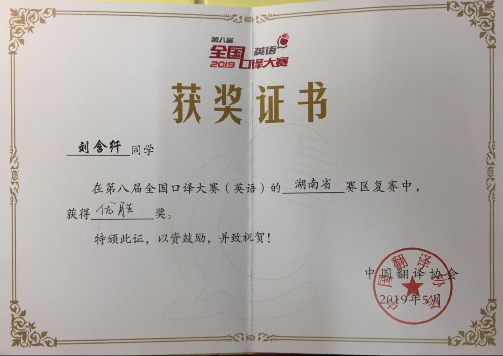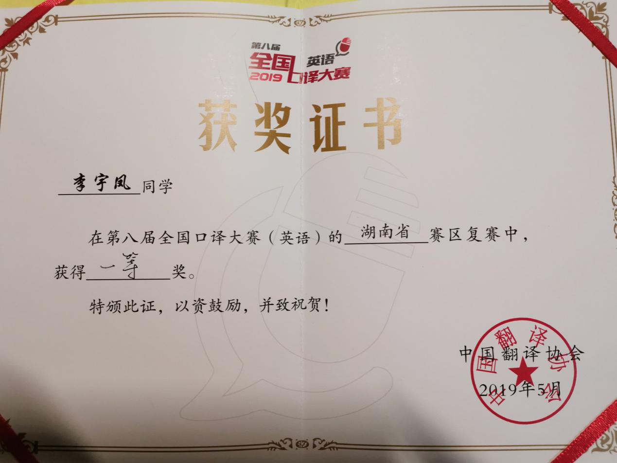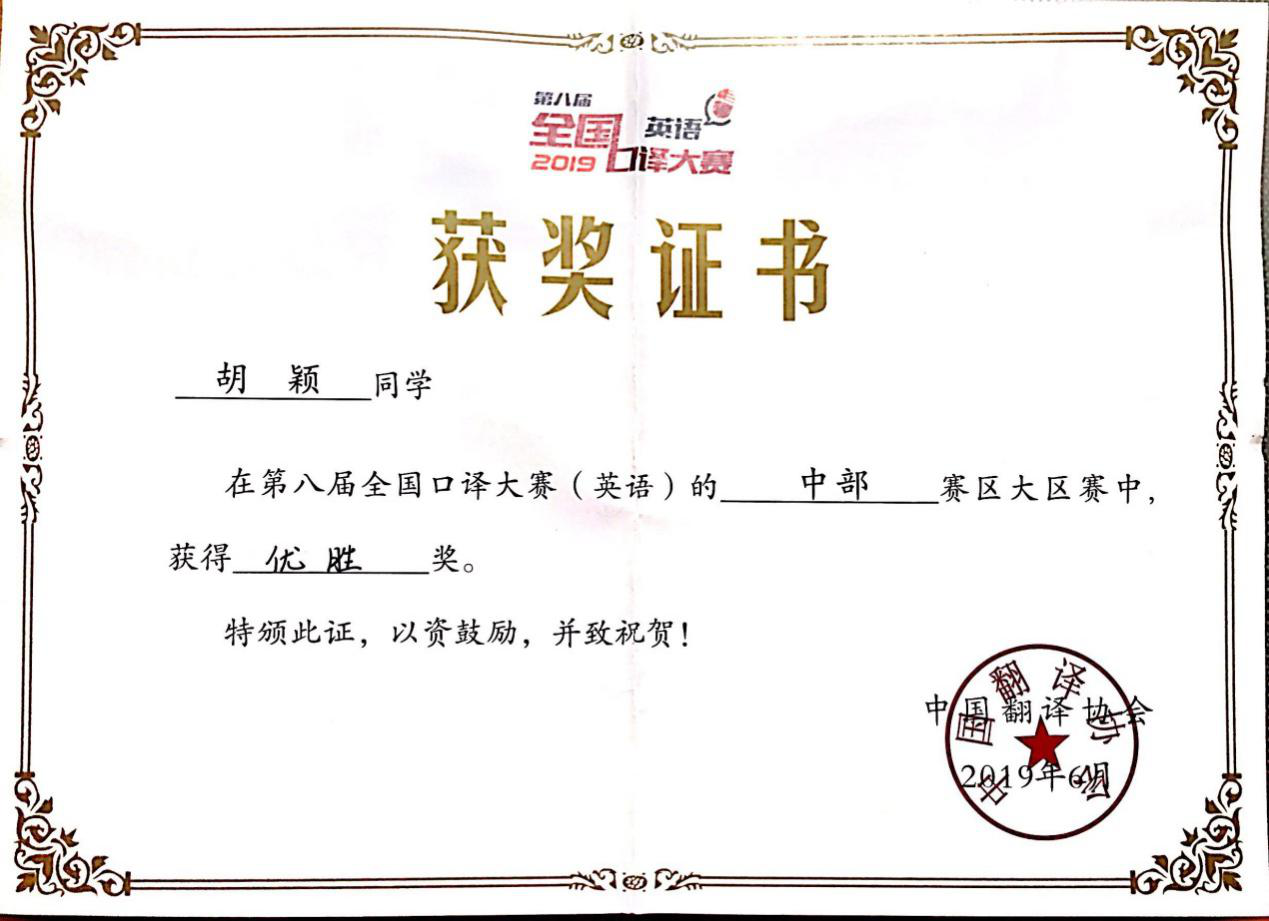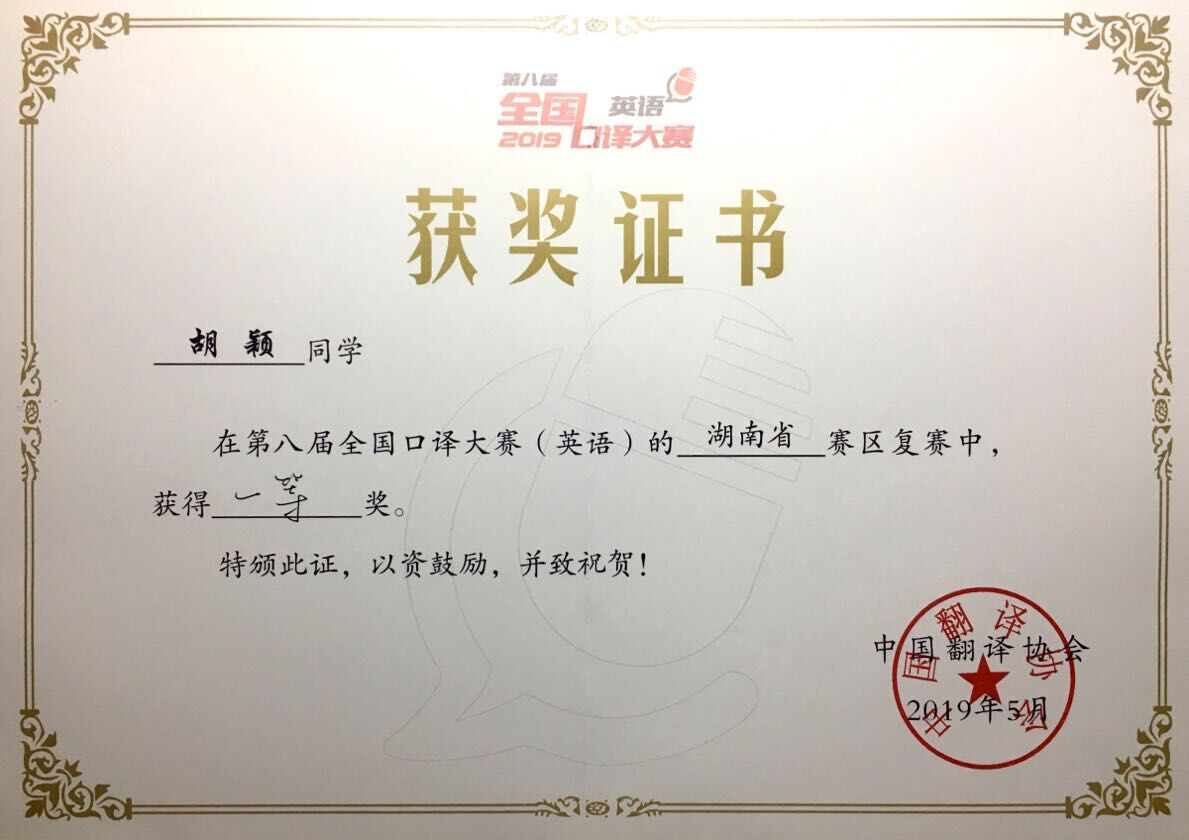 2019年6月9日,第八届全国口译大赛(英语)中部赛区大区赛在湖南长湖南农业大学沙成功举行。最终,胡颖同学在第八届全国口译大赛中部赛区获优胜奖。