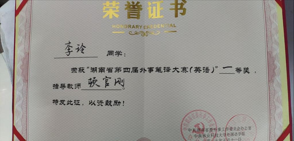 本次大赛由中共湖南省委外事工作委员会办公室主办、中南林业科技大学承办。最终,李玲同学荣获湖南省第四届外事笔译大赛(英语)一等奖。