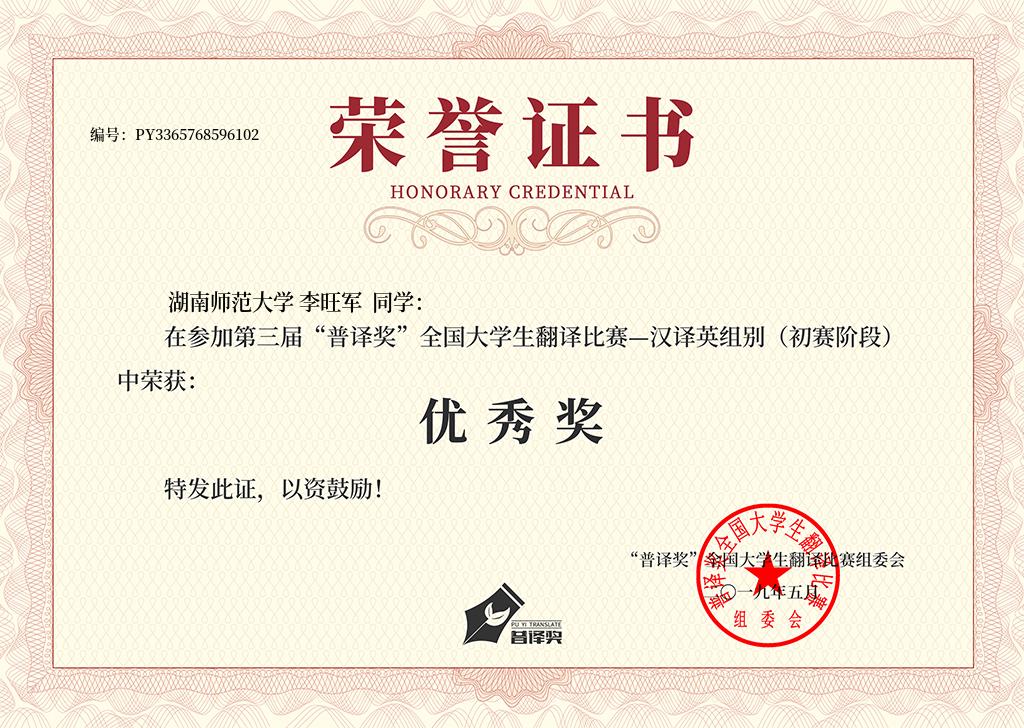 2019年5月15日第三届“普译奖”全国大学生翻译比赛由《海外英语》杂志、我爱竞赛网、172校园活动网、南京航空航天大学英语爱好者协会、江苏师范大学E青春翻译志愿者队、中北大学 Polly口语协会、山东财经大学英语联合会、福州大学英语联盟、四川外国语大学重庆南方翻译学院U&V英语俱乐部、江苏大学英语协会联合举办的外语类品牌赛事。最终,李旺军同学在第三届“普译奖”全国大学生翻译比赛—汉译英组别(初赛阶段)荣获优秀奖