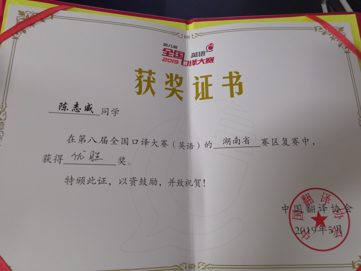 全国口译大赛以其自始至终的权威性、公正性、媒体透明度和公信力承载着各方关注最终,陈志威同学荣获第八届全国口译大赛(英语)湖南省赛区优胜奖