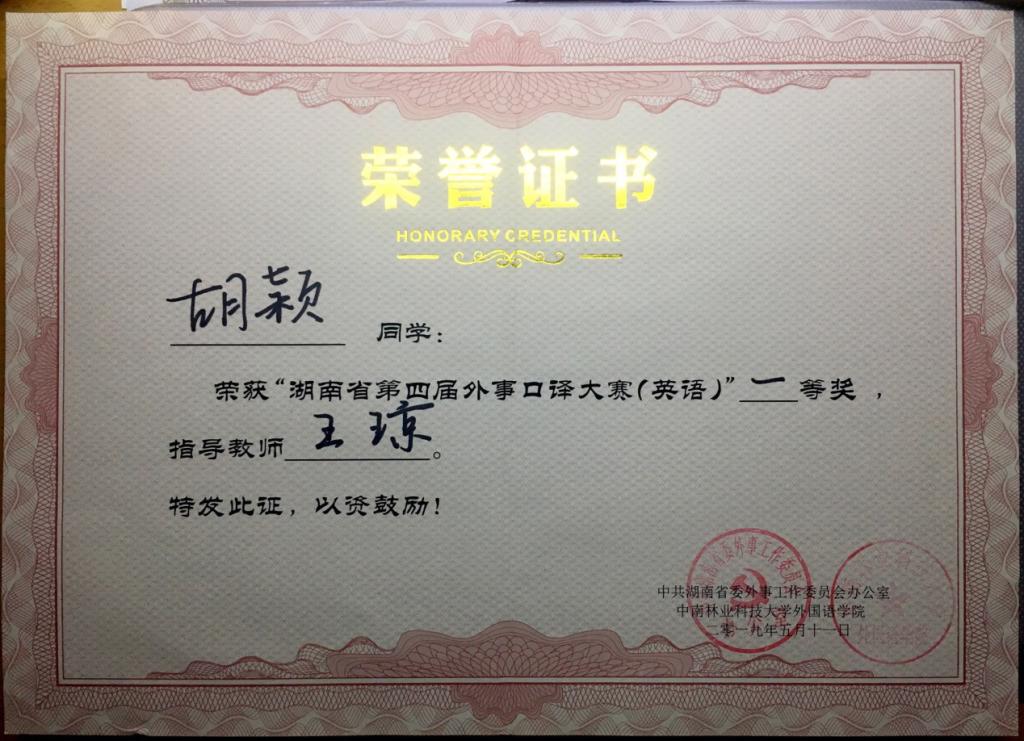 本次大赛由中共湖南省委外事工作委员会办公室主办、中南林业科技大学承办。最终,胡颖同学荣获湖南省第四届外事口译大赛(英语)一等奖。