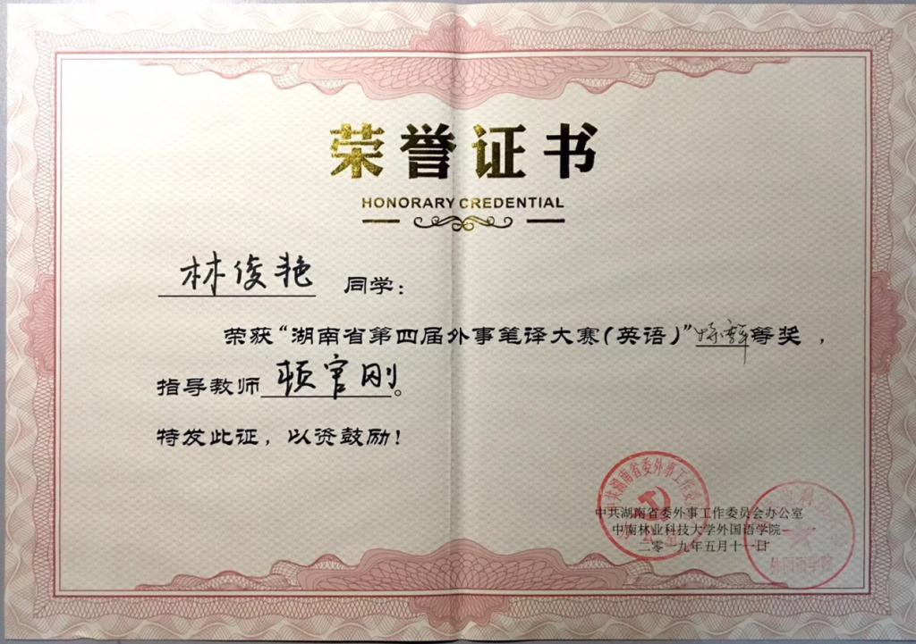 本次大赛由中共湖南省委外事工作委员会办公室主办、中南林业科技大学承办。最终,林俊艳同学荣获湖南省第四届外事翻译大赛(英语)特等奖