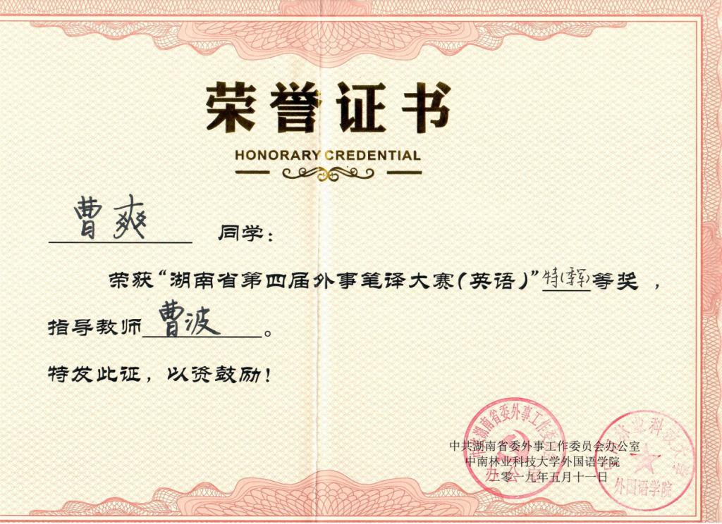 本次大赛由中共湖南省委外事工作委员会办公室主办、中南林业科技大学承办。最终,曹爽荣获湖南省第四届研究生翻译大赛(英语)特等奖。