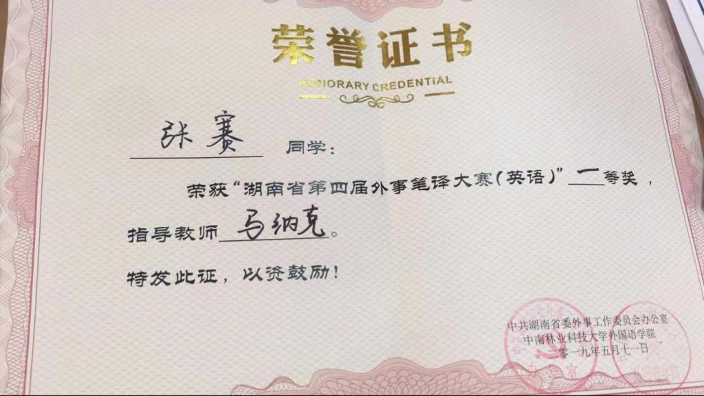本次大赛由中共湖南省委外事工作委员会办公室主办、中南林业科技大学承办。最终,张赛同学荣获湖南省第四届外事笔译大赛一等奖。