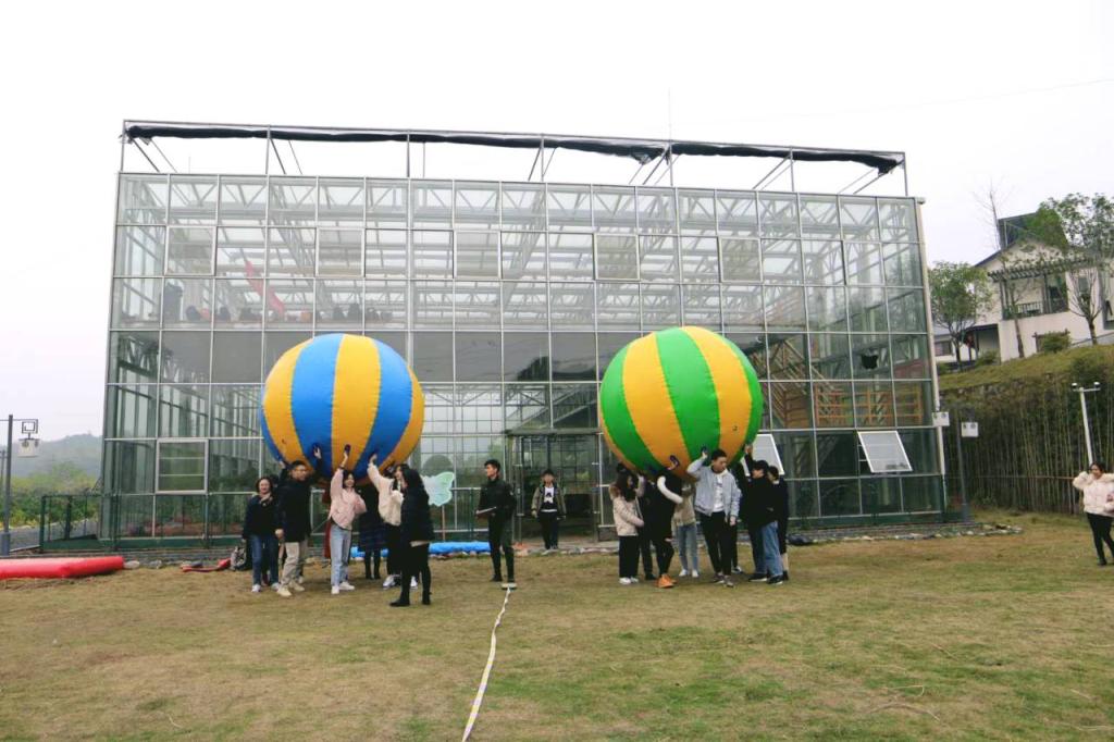 每一组的队员用气垫将球运到终点,再由终点运到起点,并颠十下球,最先完成的队伍获胜。为了保持球在气垫上,在奔跑和颠球的过程中,气垫四周参与队员需将气垫保持在一个平衡的状态。于无形中,团队的默契得到了加强。