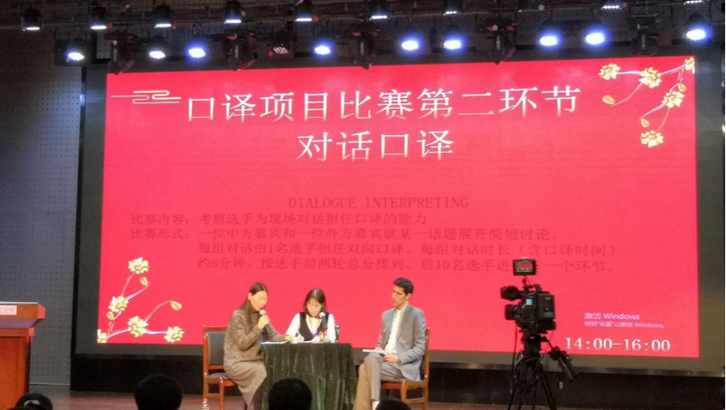 笔译决赛项目为中英互译,其中英译中(约400词),中译英(约300字),每篇文章分值为100分,总分为200分。口译决赛项目分三个环节:主旨口译、对话口译(15人)及会议口译(10人),选手最终排名根据其在三个阶段的总得分排序决定。(下图为口译比赛现场)本次决赛笔译参赛人数一百余人,口译六十余人。奖项设置:笔译一等奖5人,二等奖15人,三等奖26人。口译一等奖3人,二等奖8人,三等奖14人。
